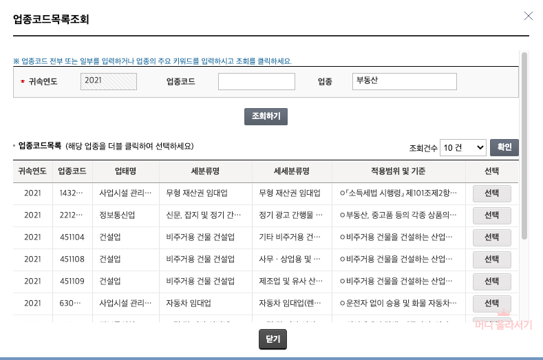 업종을 입력하고 조회하기 를 누르면 관련된 업종코드가 나옵니다.