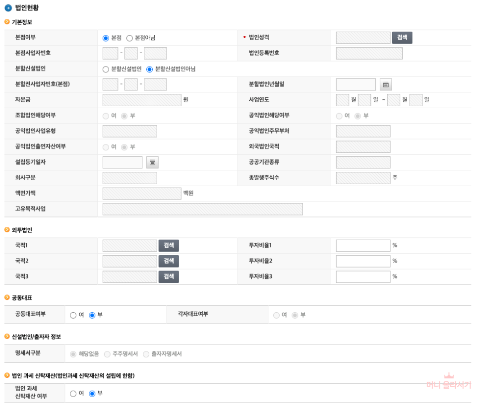 법인 기본 정보에서 먼저 법인 성격을 눌러서 선택하면 아래 비활성화된 입력창이 활성화가 됩니다.