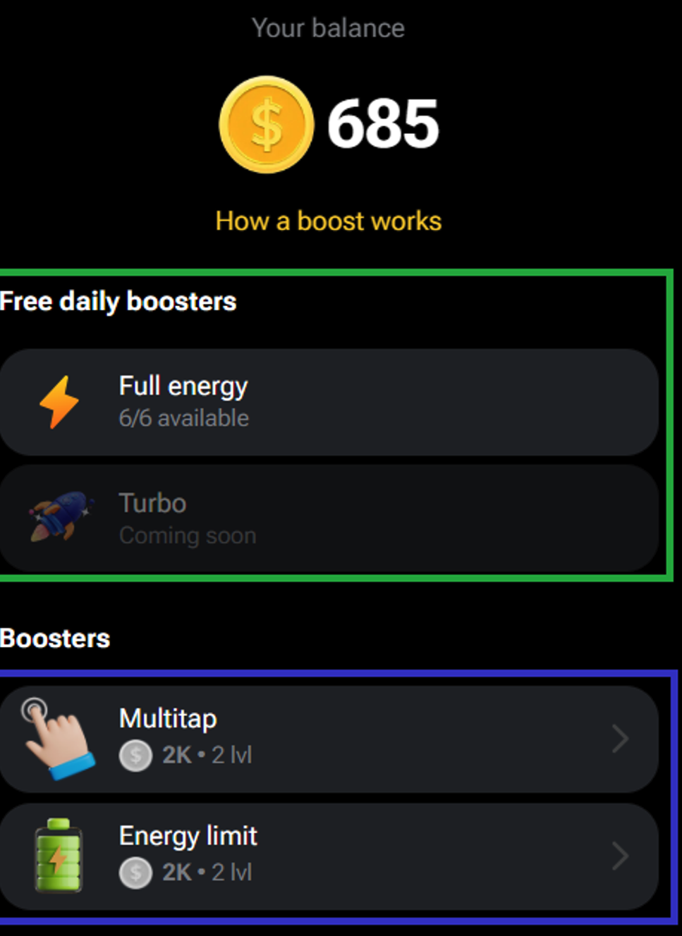 Multitap : 업그레이드하면 한번 누를때 쌓이는 코인 갯수가 올라갑니다.