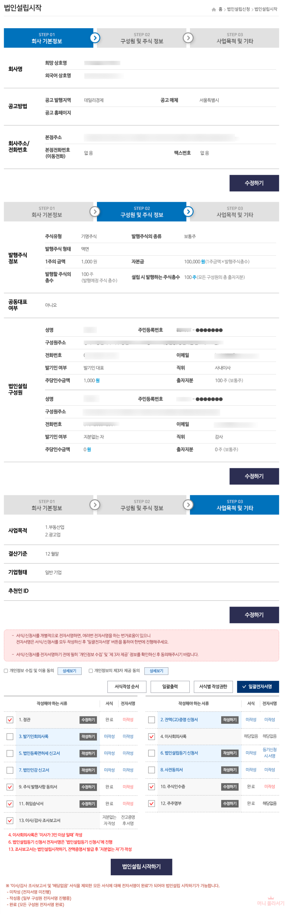 다른 나머지들은 내용만 한 번씩 확인하시고 일괄전자서명 후 법인설립 시작하기 버튼을 누르면 완료!!