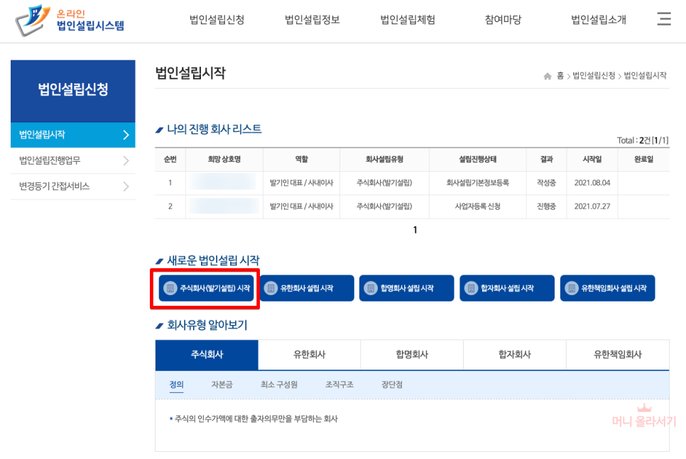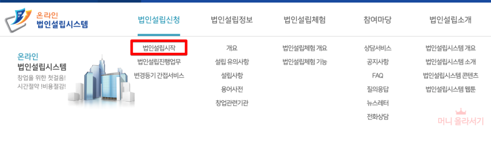 법인설립시작 메뉴를 눌러줍니다.