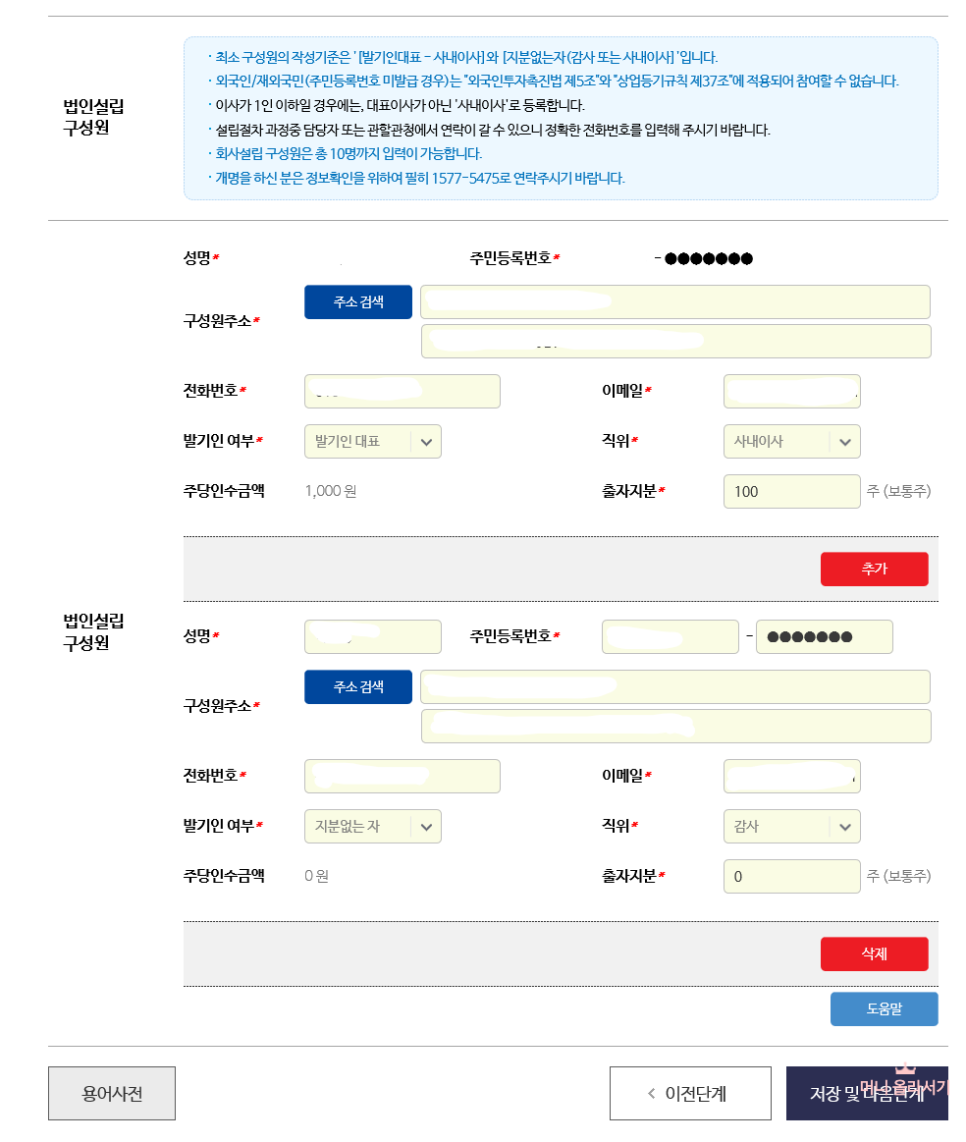 구성원 정보는 대표와 이사 or 감사 총 두 명 이상 있어야 합니다.
