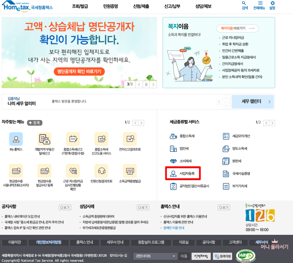 홈택스 화면 우측 하단에 "사업자등록" 메뉴가 있습니다.