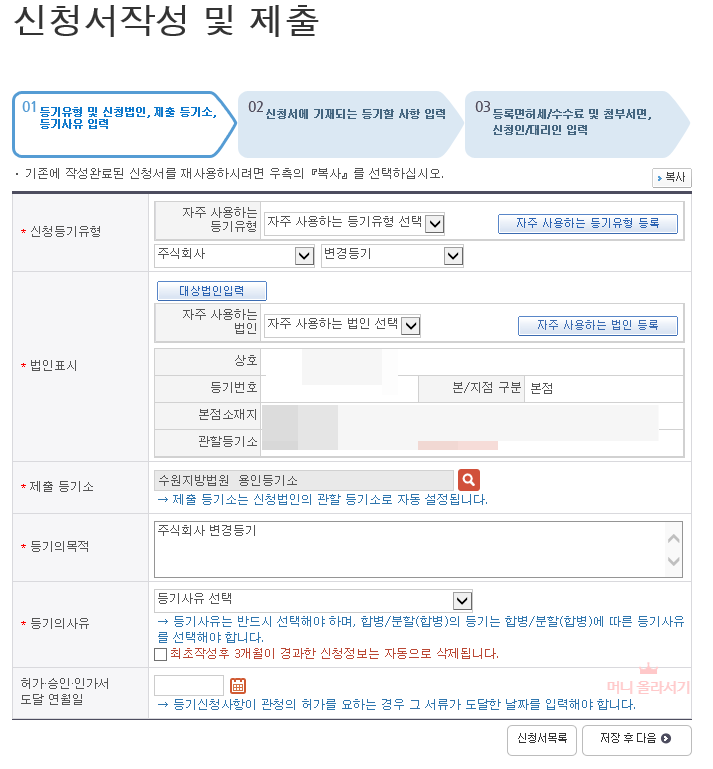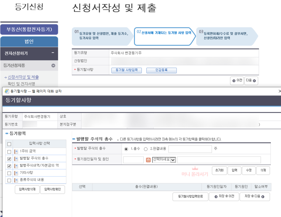 - 등기할 사항 입력 선택