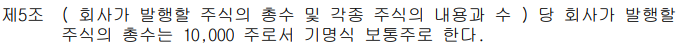 기존 정관에는 아래와 같이 발행할 주식의 총 수가 10,000주인 것을 20,000주로 변경하여
