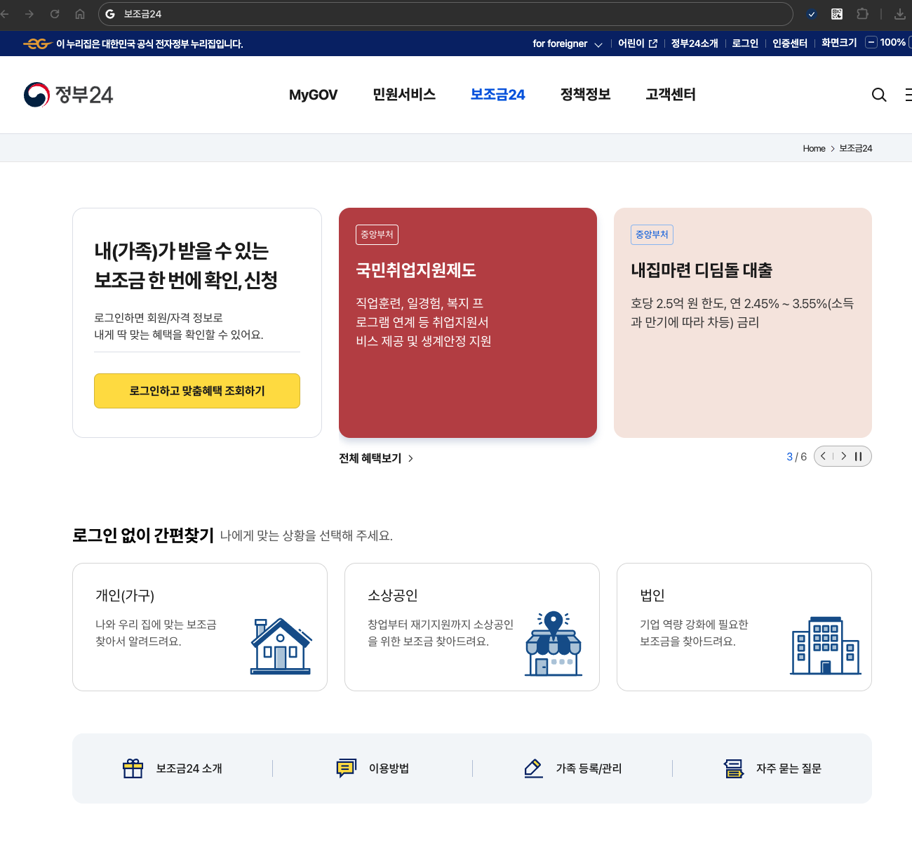 오늘은 눈에 불을 켜고 보조금 24 홈페이지를 탐색해봤습니다.