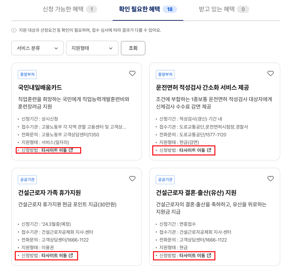 신청방법의 각각의 사이트로 이동하여 지원과 신청이 가능합니다.