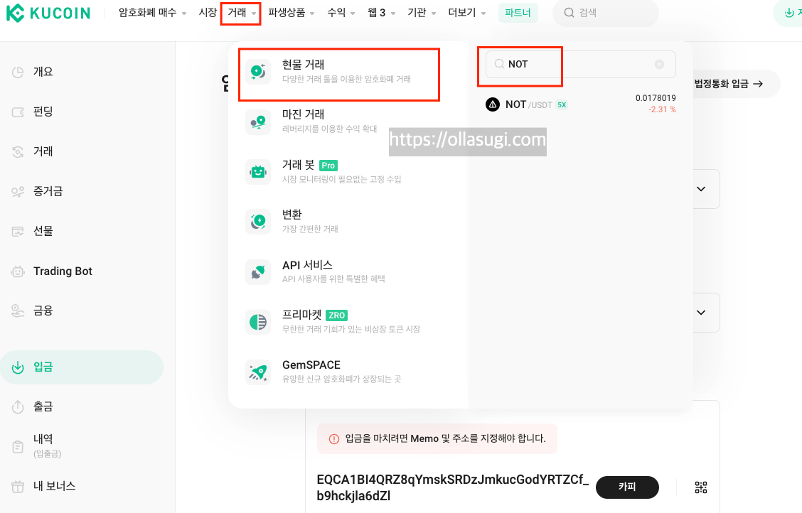 상단 메뉴에서 거래 -> 현물거래 -> NOT 검색 후 선택