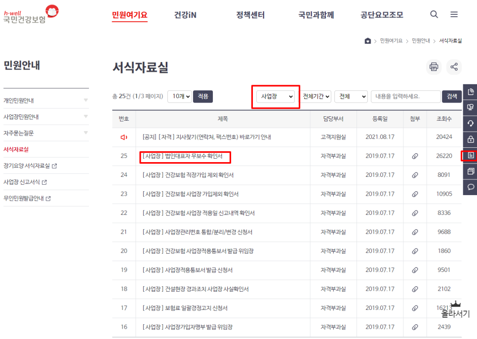 건강보험 홈페이지에서 법인대표자 무보수 확인서 서식을 다운로드합니다.