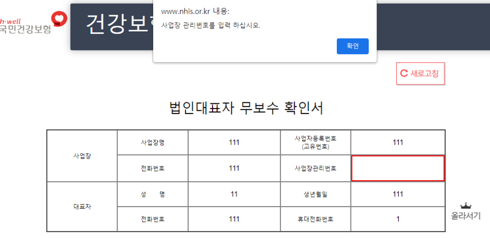 사업장 성립신고를 하지 않아 사업장관리번호가 없는데 사업장관리번호를 넣지 않으면 인쇄가 안됩니다.