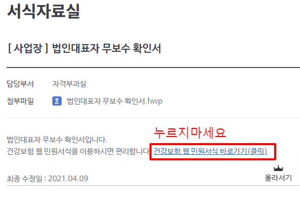 건강보험 홈페이지에서 법인대표자 무보수 확인서 서식을 다운로드합니다.